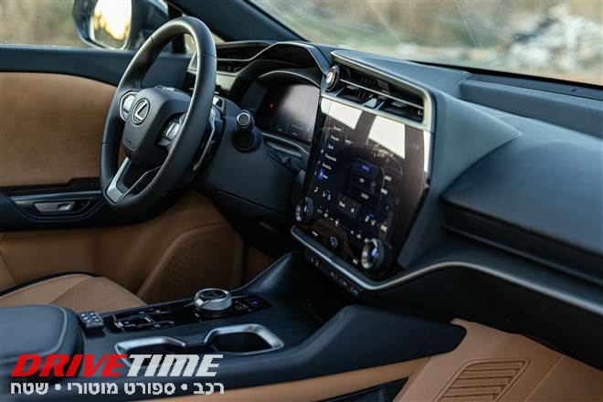אחרי שהתרשמנו מהעיצוב החיצוני הייחודי, הגיע הזמן להיכנס פנימה. אם נתחיל מהסוף, אין ספק שתא הנוסעים של ה-RZ מעניק תחושת יוקרה: משטחים דמויי עור חום (קאמל בשפת העם) מצפים את המושבים ודיפוני הדלתות ומשתלבים היטב עם דיפוני הפלסטיק והשטיח של רצפת הרכב שבאותו גוון.החומרים מהם מורכב תא הנוסעים מרגישים ברמה גבוהה.הקונסולה שבין המושבים עשויה מחומר דמוי עץ. חבק ההגה מרופד בד בחלקו התחתון כדי שהרגליים לא יתחככו בפלסטיק, רחמנא ליצלן. תאורה עשירה שמופעלת ברפרוף אצבע ומשטח טעינה אלחוטי כבר הפכו להיות סטנדרט אבל עדיין ראויים לאזכור.