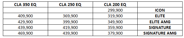 ה-CLA EQ מציעה טווח נסיעה של עד 792 ק"מ (WLTP), הספק מירבי של 200 קילוואט (260 בגרסת ה-350), מומנט 335 נ"מ (515 בגרסת ה-350), קיבולת סוללה 85 קוט"ש וצריכת אנרגיה נמוכה במיוחד של 14.1-12.2 קוט"ש ל-100 ק"מ. פלטפורמת ה-800 וולט המתקדמת מאפשרת טעינה מהירה של עד 325 ק"מ בעשר דקות בלבד, עם עמדת טעינה מתאימה. הסוללות החדשות, עם צפיפות אנרגיה גבוהה ותכולת קובלט מופחתת, מצמצמות את פליטת המזהמים בכ-30% בהשוואה לדור הקודם.