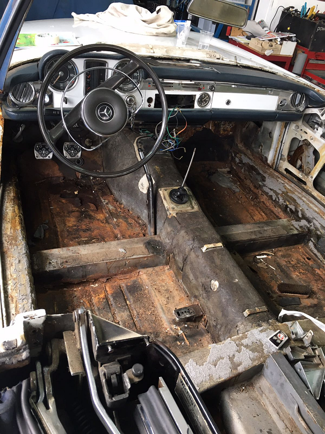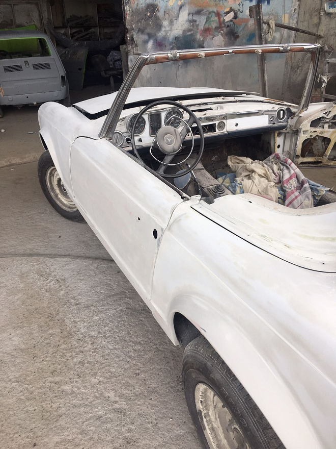 כשהיא עירומה כביום היוולדה, נכנסה המרצדס לפחחות במסגרתה הוחלפה ריצפת הרכב ברצפה חדשה מקורית שהוזמנה מגרמניה, הוחלפו הקורות לחדשות ושוחזרו חלקי גוף שהותקפו בקורוזיה. שיפוץ גוף האוטו לא כלל שימוש במילויים למיניהם אלא שיחזור מקורי של מבנה הרכב.